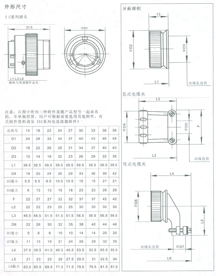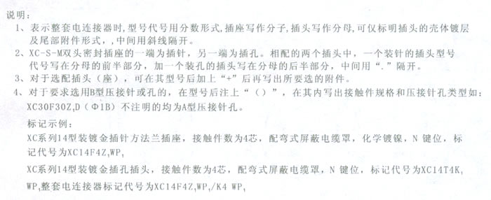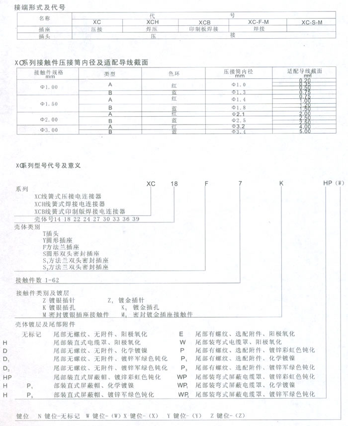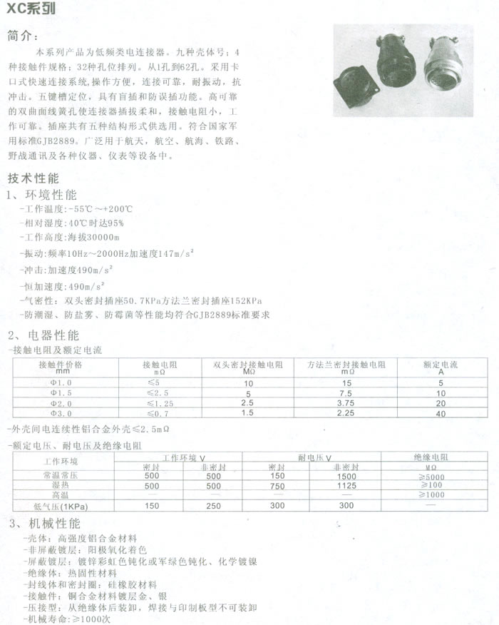 (一)、簡介: XC系列圓形電連接器(航空插頭)為低頻類電連接器。九種殼體號;4種接觸件規格;32種孔位排列。從1孔到62孔。采用卡口式快速連接系統,操作方便,連接可靠,耐振動,抗沖擊。五鍵槽定位,具有盲插和防誤插功能。高可靠的雙曲面線簧孔使連接器插拔柔和,接觸電阻小,工作可靠。插座共有五種結構形式選用。符合國家軍用標準GJB2889。廣泛用于航天,航空,航海、鐵路、野戰通訊及各種儀器、儀表等設備中。 (二)、XC系列圓形電連接器(航空插頭)主要技術性能: 1、環境技術性能 工作溫度:–55℃~+200℃ 相對濕度:40℃時達95﹪ 工作高度:海拔30000m 振動:頻率10Hz~2000Hz,加速度147m/s2 沖擊:加速度490m/s2 恒加速度:490m/s2 氣密性:雙頭密封插座50.7 Kpa方法蘭密封插座152 KPa 防潮濕、防鹽霧、防霉菌等性能均符合GJB2889標準要求。 2、電氣性能 接觸電阻及額定電流: