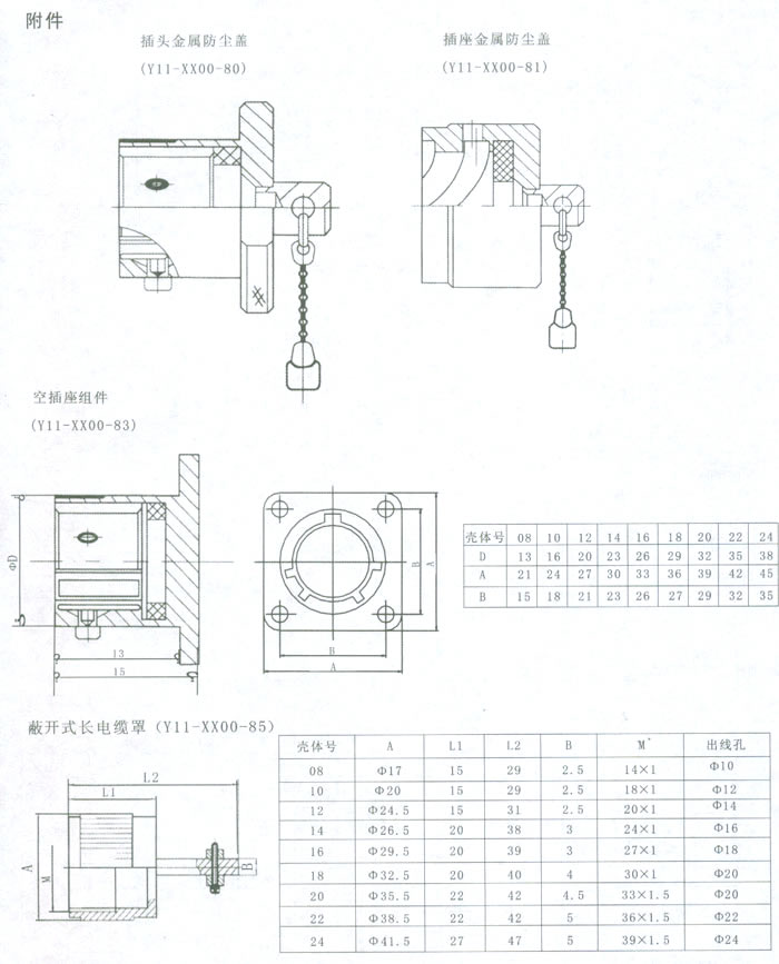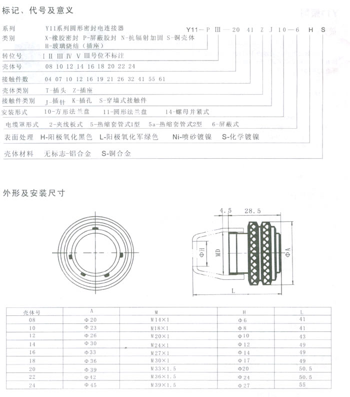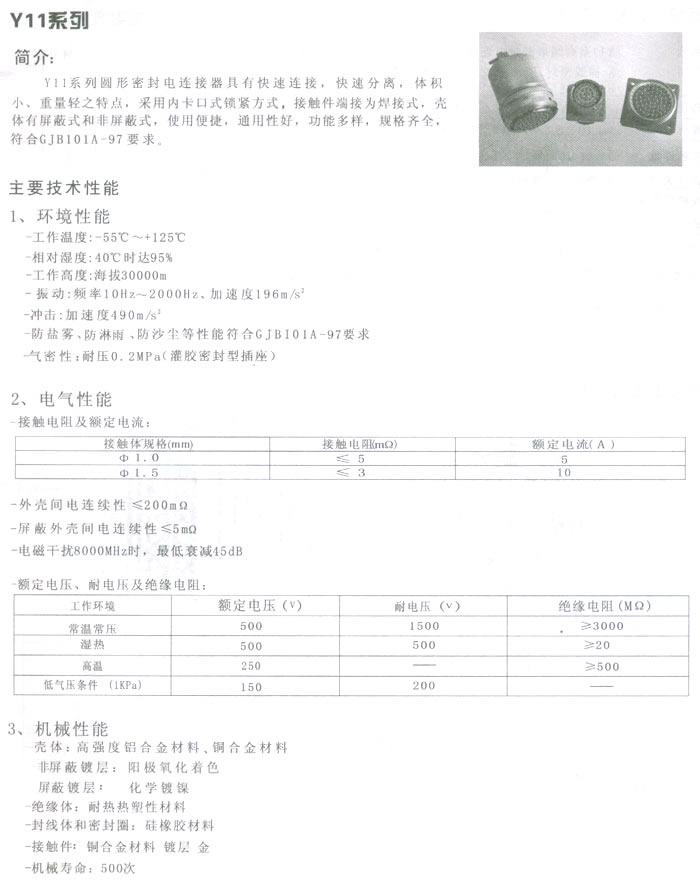 一、Y11系列圓形電連接器(航空插頭)簡介 Y11系列圓形密封電連接器(航空插頭)具有快速連接,快速分離,體積小,重量輕之特點,采用內卡口式鎖緊方式,接觸件端接為焊接式,殼體有屏蔽式和非屏蔽式,使用便捷,通用性好,功能多樣,規格齊全,符合GJB101A—97要求。 二、主要技術性能1、環境技術性能
