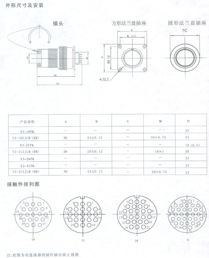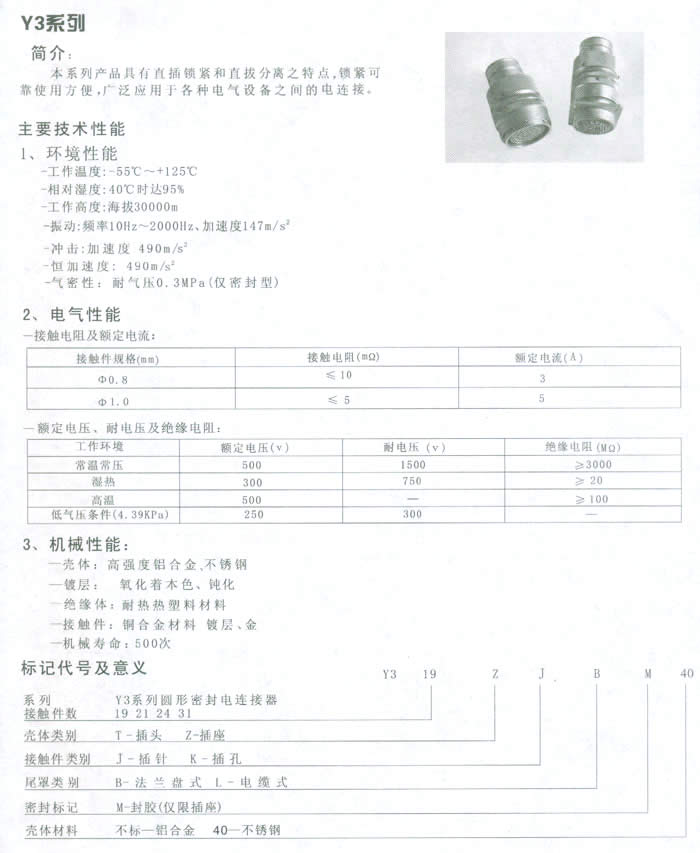 本系列電連接器具有直插鎖緊和直拔分離之特點,鎖緊可靠使用方便,廣泛應用于各種電氣設備之間的電連接二、Y3系列圓形電連接器主要技術性能