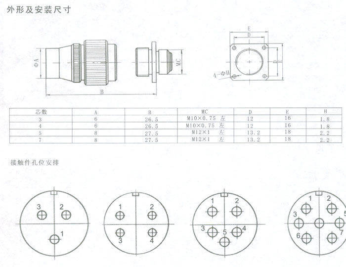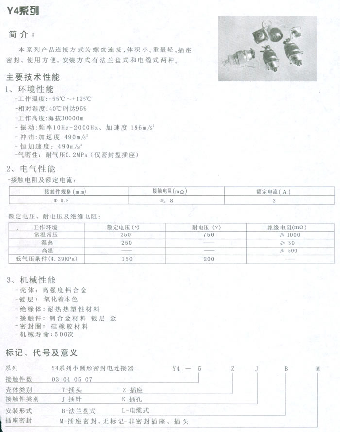 一、Y4系列圓形電連接器簡介 本系列電連接器連接方式為螺紋連接,體積小,重量輕、插座密封、使用方便。安裝方式有法蘭盤式和電纜式兩種 二、主要技術性能1、環(huán)境技術性能