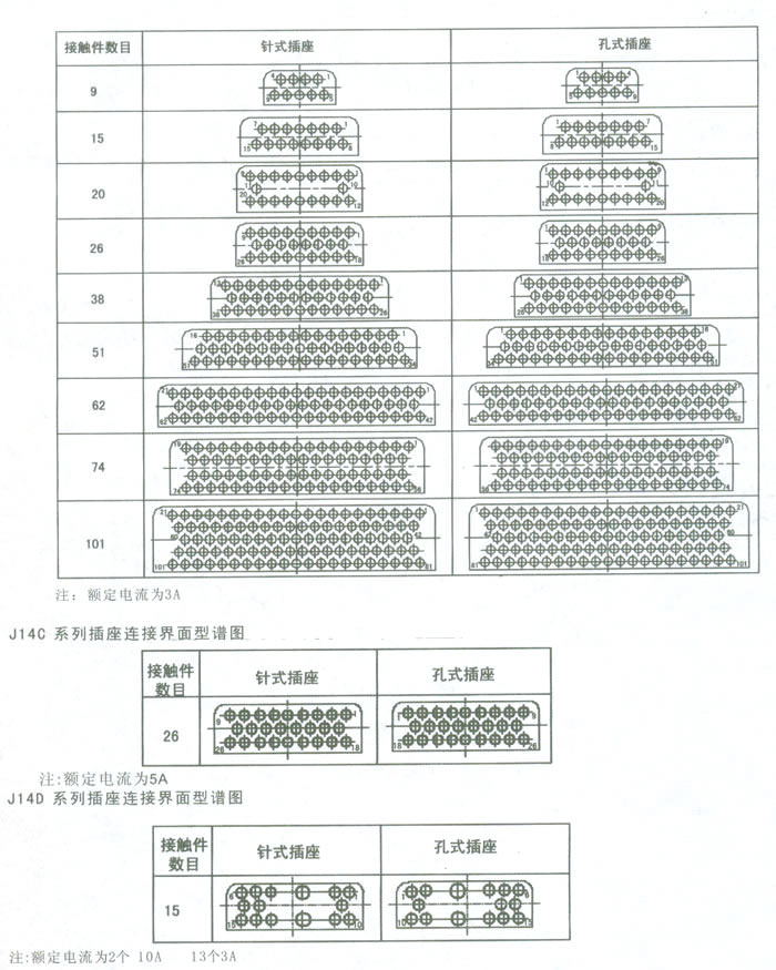 一、J14A、C、D系列矩形電連接器簡介 本系列電連接器(航空插頭)屬于低頻電連接器。雙保險鎖緊機(jī)構(gòu),是矩形電連接器中兼顧操作快捷、使用可靠的連接鎖緊形式、端接形式為焊接。該系列產(chǎn)品規(guī)格齊全,可分為針式、孔式插頭,針式面板式、孔式面板式插座;針式電纜式、孔式電纜式插座等多種規(guī)格。另外J14A系列插座還有直插印制板形式和90度彎插印制板形式。 二、J14系列矩形電連接器適用范圍 適用于戰(zhàn)略武器系統(tǒng)、航天衛(wèi)星系統(tǒng)、運(yùn)載火箭、地面保障系統(tǒng),也可廣泛用于各種電子儀器、儀表及電纜間的連接。 三、使用環(huán)境條件 工作溫度:–55℃~+125℃ 四、主要技術(shù)性能 額定電流(A):