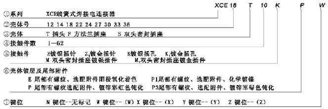 說明 1、表示整套電連接器時,標記代號采用分數形式,插座標記寫作分子,插頭標記寫作分母,中間用斜線隔開。 2、XCE雙頭密封插座的一端為插針,另一端為插孔,裝針的結構外形標記寫在分母的前半部分,裝孔的寫在分母的后半部分,中間用“·”隔開 3、對于選配附件的插頭(座),可在其標記代號后加+再寫出所選附件。 標記示例 1、XCE系列18型裝10芯鍍銀插孔插頭,屏蔽、殼體鍍鋅彩虹色鈍化,W鍵位其標記代號為:XCE18T10KP(W) 2、XCE系列18型方法蘭裝10芯鍍銀插針插座,屏蔽、殼體鍍鋅彩虹色鈍化,W鍵位其標記代號為:XCE18F10ZP(W) 3、整套連接器標記代號為:XCE18F10ZP(W)/P 4、標記代號為XCE18S10MP/P.P3其含意為: XCE系列雙頭密封插座和兩個插頭配套的整套連接器。其中,插座為18型裝有10芯鍍銀插針的雙頭密封插座,屏蔽、殼體鍍鋅彩虹色鈍化,N鍵位。一只插頭為18型裝有10芯鍍銀插針,屏蔽、殼體鍍鋅彩虹色鈍化。另一只插頭為18型裝有10芯鍍銀插孔,屏蔽、殼體鍍鋅彩虹色鈍化,兩只插頭均為N鍵位。 外形尺寸 XCE插頭