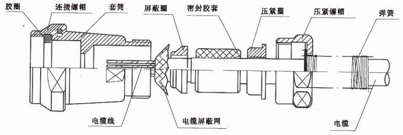 特殊功能的附件 根據用戶的特殊使用要求。特別是在船舶工業,因其使用環境惡劣,不僅要求電連接器具有防鹽霧放淋雨、防霉菌等性能,在艙外使用時還要求具有一定的防水功能。針對于此,我廠向用戶推薦以下附件供用戶選用。 XC-FJJP、XC-FJJP01屏蔽電纜附件 XC-FJJP適用于較軟的電纜;XC-FJJP01適用于較硬的電纜。 該類附件吸收水密結構的優點,用填料涵夾緊電纜,防轉、夾緊力大且不傷電纜,是目前夾緊力最大,能實現水密及360°電磁屏蔽,外屏蔽套和內屏蔽套電纜皆能使用的尾部附件,特別適合海洋、沼澤、涵洞等野外惡劣環境。 裝配示意圖如下 ![]() 使用方法 1、電纜依次從彈簧壓緊螺帽、壓緊圈、密封膠套、屏蔽圈中穿過,電纜屏蔽網翻套在屏蔽圈上。 2、電纜芯線與插頭接觸件端接。 3、連接螺帽與插頭尾端螺紋旋緊,通過期中的膠圈與插頭密封。 4、旋緊壓緊螺帽,密封膠套受壓變形緊緊地包在電纜上,夾緊電纜并實現附件與電纜的密封,同時使屏蔽圈,屏蔽網、套筒緊緊貼在一起,實現屏蔽網與附件外殼的電連續性。 5、彈簧套在電纜與附件的結合處,防止電纜因劇烈彎曲而遭到破壞。 ![]() 使用方法 1、電纜依次從彈簧壓緊螺帽、壓緊圈、密封膠套、屏蔽圈中穿過,電纜屏蔽網翻套在屏蔽圈上。 2、電纜芯線與插頭接觸件端接。 3、連接螺帽與插頭尾端螺紋旋緊,通過期中的膠圈與插頭密封。 4、旋緊壓緊螺帽,密封膠套受壓變形緊緊地包在電纜上,夾緊電纜并實現附件與電纜的密封,同時使屏蔽圈,屏蔽網、套筒緊緊貼在一起,實現屏蔽網與附件外殼的電連續性。 5、彈簧套在電纜與附件的結合處,防止電纜因劇烈彎曲而遭到破壞。 注:電纜直徑范圍為(D-2)-0