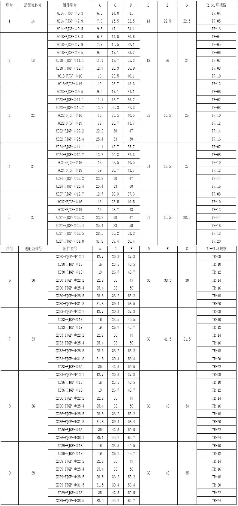 標記示例 XC27FJJP-20表示可與27號殼體適配,最大出線口直徑為Φ20 XC-FJJP01尺寸表 ![]() 2、XC-FJGP直式屏蔽電纜附件、X-FJGWP彎式屏蔽電纜附件 該附件用于帶有屏蔽網的屏蔽電纜夾緊,僅適用于屏蔽電連接器。分有直式和彎式兩大類,通過端面膠圈和尾部加套熱縮管的方法來實現密封。該附件適用于合金記憶技術,通過TI-NI合金記憶環加熱收縮,把屏蔽網緊箍在附件尾端,實現屏蔽網與附件殼體的點連續。 注:TI-NI合金記憶環為選配零件,訂貨時若需要TI-NI合金記憶環,請在型號FJGP或JGWP后加字幕“A",即為XC-FJGPA或XC-FJGWPA 使用方法 1、電纜依次從熱縮管、TI-NI合金記憶換、套筒中穿過 2、電纜芯線與插頭接觸件端接。 3、連接螺帽與插頭尾端螺紋旋緊,通過其中的膠圈與插頭密封。 4、電纜屏蔽網包在附件尾端,通過記憶環加熱收縮,把屏蔽網緊箍在附件尾端上,實現屏蔽網與附件殼體的電連接。 5、擰緊鎖緊螺釘 6、熱縮管套在電纜與附件的結合處,加熱收縮,緊緊地包在附件與電纜上,實現附件與電纜的密封。 *記憶環的加熱收縮:可采用專用電阻加熱器利用記憶環自身電阻通電加熱,或熱風槍加熱,在記憶環上的示溫色標由綠色轉變為黑色時即為記憶環收縮完畢,此時環的溫度約為165℃,停止加熱。注意加熱時要保證記憶環受熱均勻。通電加熱約4-5秒,熱風槍約需45秒至1分鐘。 XC-FJGP附件型尺寸與Ti-Ni環規格對照表 ![]() ![]() 更多詳情請咨詢:http://m.bjzztd.com | |||||||||||||||||||||||||||||||||||||||||||||||||||||||||||||||||||||||||||||||||||||||||||||||||||||||||||||||||||||||||||||||||||||||||||||||||||||||||||||||||||||||||||||||||||||||||||||||||||||||||||||||||||||||||||||||||||||||||||||||||||||||||||||||||||||||||||||||||||||||||||||||||||||||||||||||||||||||||||||||||||||||||||||||||||||||||||||||||||||||||||||||||||||||||||||||||||||||||||||||||||||||||||||||||||||||||||||||||||||||||||||||||||||||||||||||||||||||||||||||||||||||||||||||||||||||||||||||||||||||||||||||||||||||||||||||||||||||||||||||||||||||||||||||||||||||||||||||||||||||||||||||||||||||||||||||||||||||||||||||||