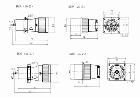 ① 圓形分離電連接器 ② 設(shè)計(jì)序號(hào) ③ 改進(jìn)型 ④ 芯數(shù):20、50 ⑤ 電連接器類別:T-插頭,Z-插頭