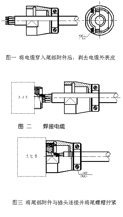 將尾部附件從插頭上擰開并將尾螺帽擰開(如圖所示)以便電纜線穿入—電纜線從尾部附件的孔中穿入—剝線—焊線—與插頭尾部連接—將護線套或夾線板擰緊。其主要過程與步驟用下列3個圖來表示。