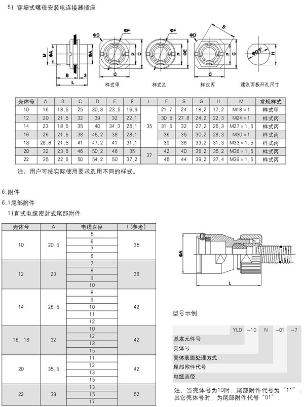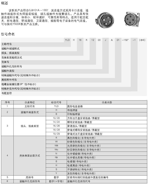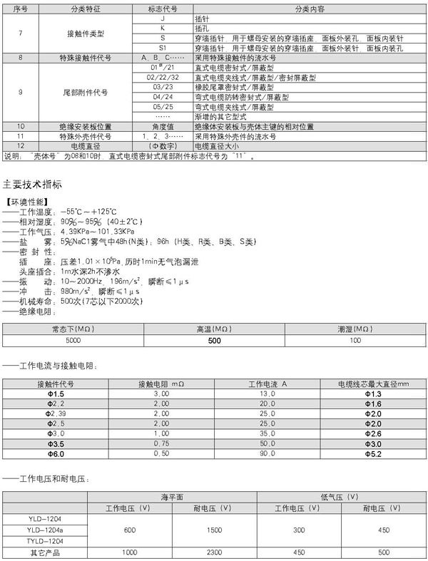 ![]() 一、YLD圓形電連接器簡介 本系列產品為產品內輸送大電流的電源連接器,符合GJB101A-97標準,插孔為線簧插孔,卡口快速連接,端接方式為焊接,與Y50DX同型號產品互換。 技術特性 環境性能 工作溫度:-55℃~+125℃ 相對濕度:40℃時達95% 工作高度:海拔30000m 振動:頻率10Hz~2000 Hz加速度196m/s2 沖擊:加速度980m/s2 密封性:耐壓0.2MPa 防鹽霧,防潮濕,防霉菌性能等符合GJB101A-97標準的要求。 電氣性能 接觸電阻及額定電流