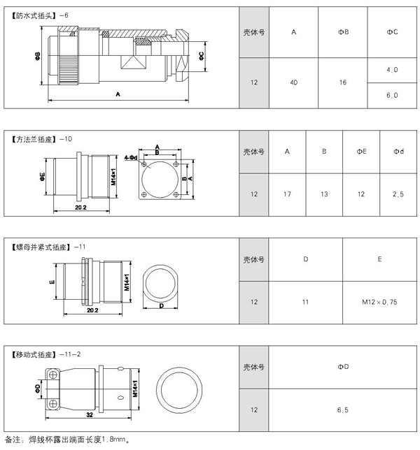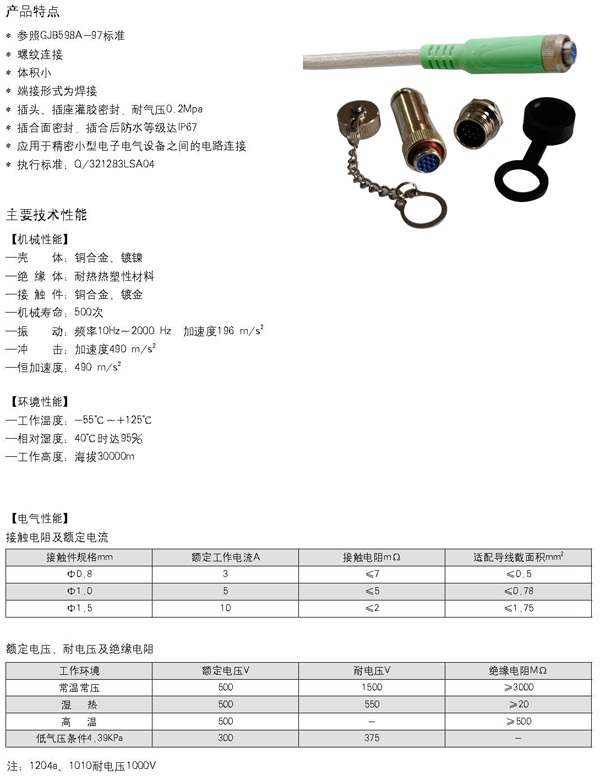 YQ12小圓形電連接器主要適用于低壓信號 連接,采用螺紋連接,插頭、插座灌膠密封,該產品具有頭座插好后防雨淋的特點。 主要技術性能 環境性能 —工作溫度:-20℃~70℃ —相對濕度:40℃時達95% 機械性能 —殼 體:銅合金、鍍鎳 —接 觸 件:銅合金、鍍金 —振動:頻率10Hz~2000 Hz加速度196m/s2 —沖擊:加速度490m/s2 —絕緣體:熱塑性材料 —機械壽命:500次 電氣性能 —接觸電阻及額定電流 電氣性能 接觸電阻及額定電流